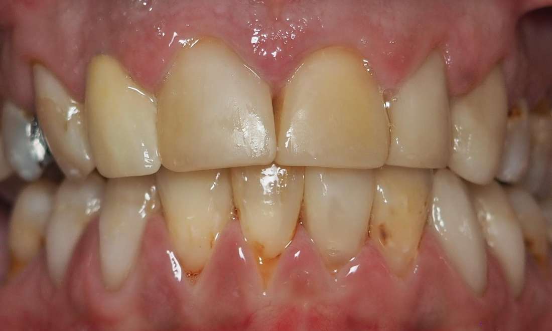 Patient had years of dental neglect, poor dietary habits, and smoking that lead to rampant tooth decay and gum disease. Gum treatment was provided to improve gum health, and special cavity resistant fillings were placed once the decay was removed. The patient also made some behavior changes that lead to much better oral health. These fillings stabilized the teeth, and will last for a number of years until the patient is ready for cosmetic treatment!